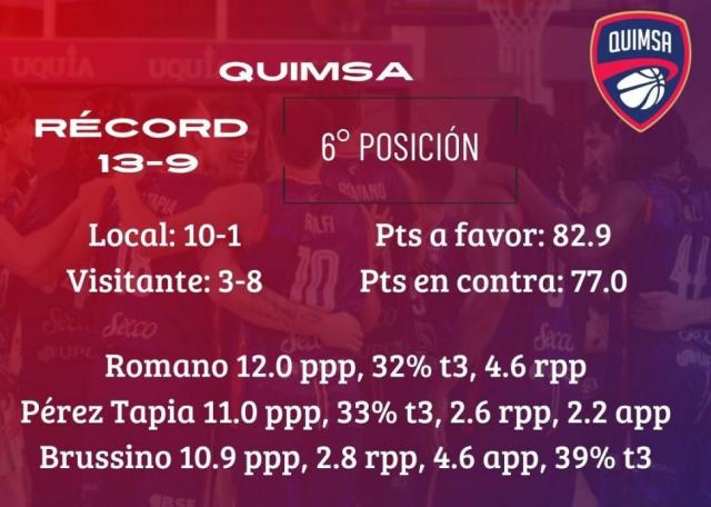 El santiagueño quiere seguir de racha. Quimsa viene de una importante victoria ante Regatas dentro de un momento sumamente gris y chato en su juego y resultados. Necesita responder mejor para mantenerse cerca de los primeros cinco lugares. Robinson debe mostrar otra imagen sumado a la banca y la ofensiva en general.